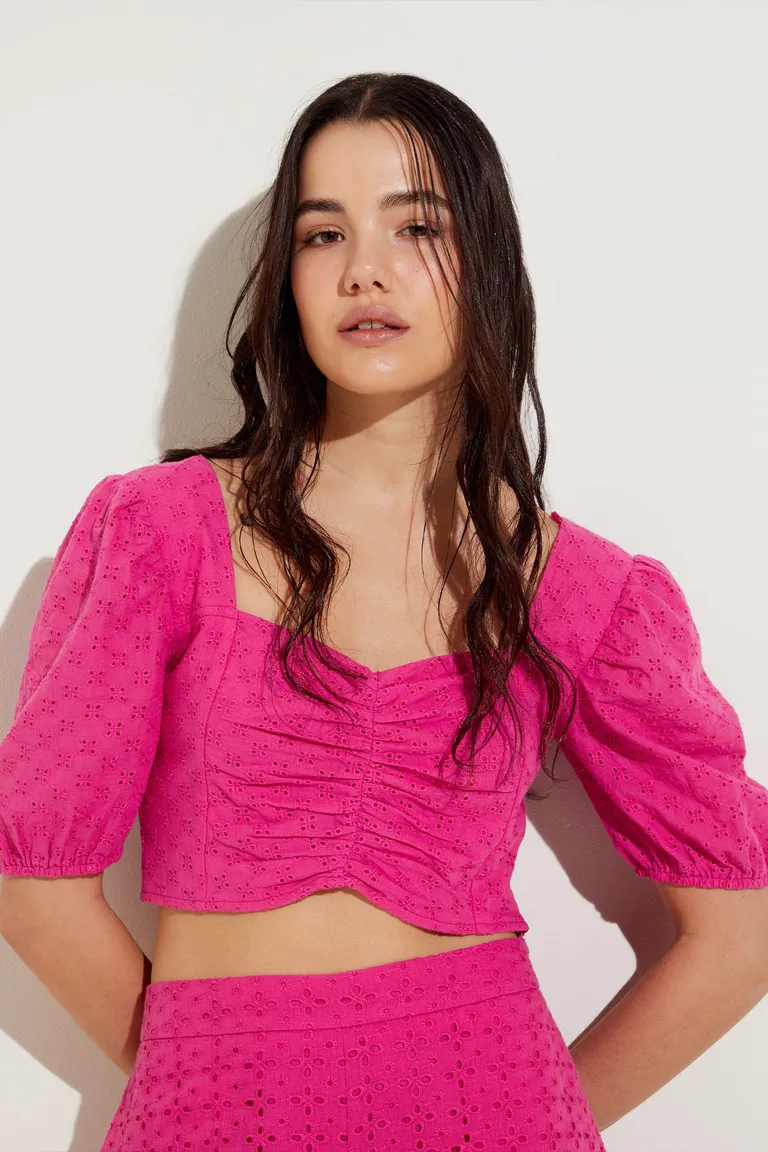 Top corto con mangas tipo farol y detalle de frunce en el frente. Presenta un diseño de broderie con textura calada, escote definido y cierre lateral invisible. Ideal para combinar en looks frescos y femeninos, con ajuste en la espalda mediante punto smock para mayor comodidad.