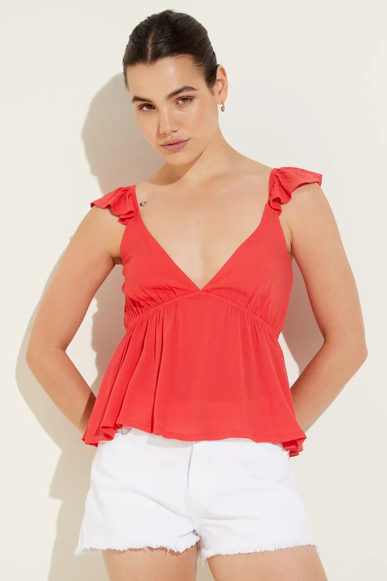 Top de mujer con escote en V profundo, breteles con volados y detalle de elástico bajo el busto que aporta una silueta ajustada y femenina. Una prenda versátil ideal para crear diversos outfits casuales durante la temporada de primavera y verano.