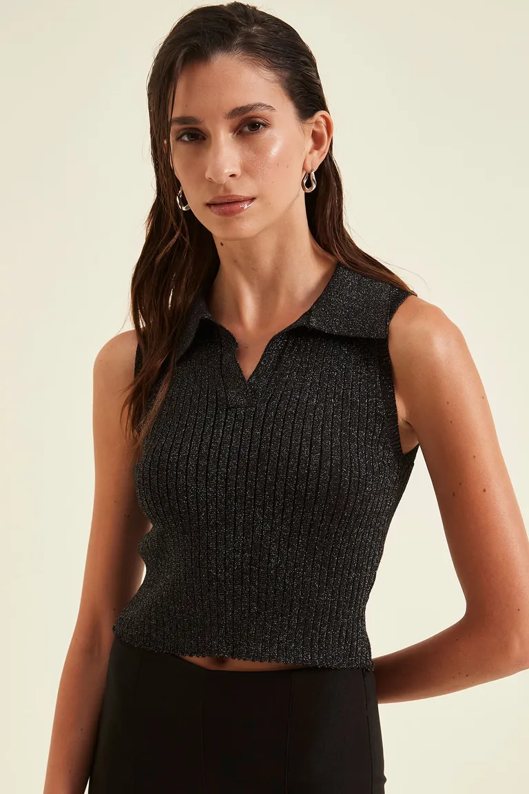 Top de punto sin mangas con cuello tipo polo, confeccionado con detalle de hilo brillante. Presenta una textura acanalada y un calce entallado que se ajusta a la figura. Ideal para complementar diversos outfits gracias a su diseño versátil.