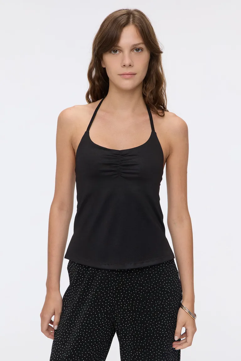 Top de calce entallado con breteles finos que se anudan al cuello. Presenta un delicado frunce central en el escote y aberturas laterales en el ruedo, aportando un movimiento fluido y moderno. Una prenda versátil ideal para integrar en looks casuales o nocturnos, ofreciendo comodidad y un diseño minimalista de líneas limpias.