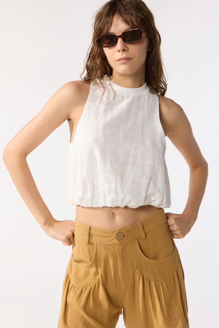 Top sin mangas con escote redondo, diseñado con detalles de broderie. Presenta una silueta ajustada con ruedo elástico y cierre invisible en la espalda, ideal para un look fresco y versátil.