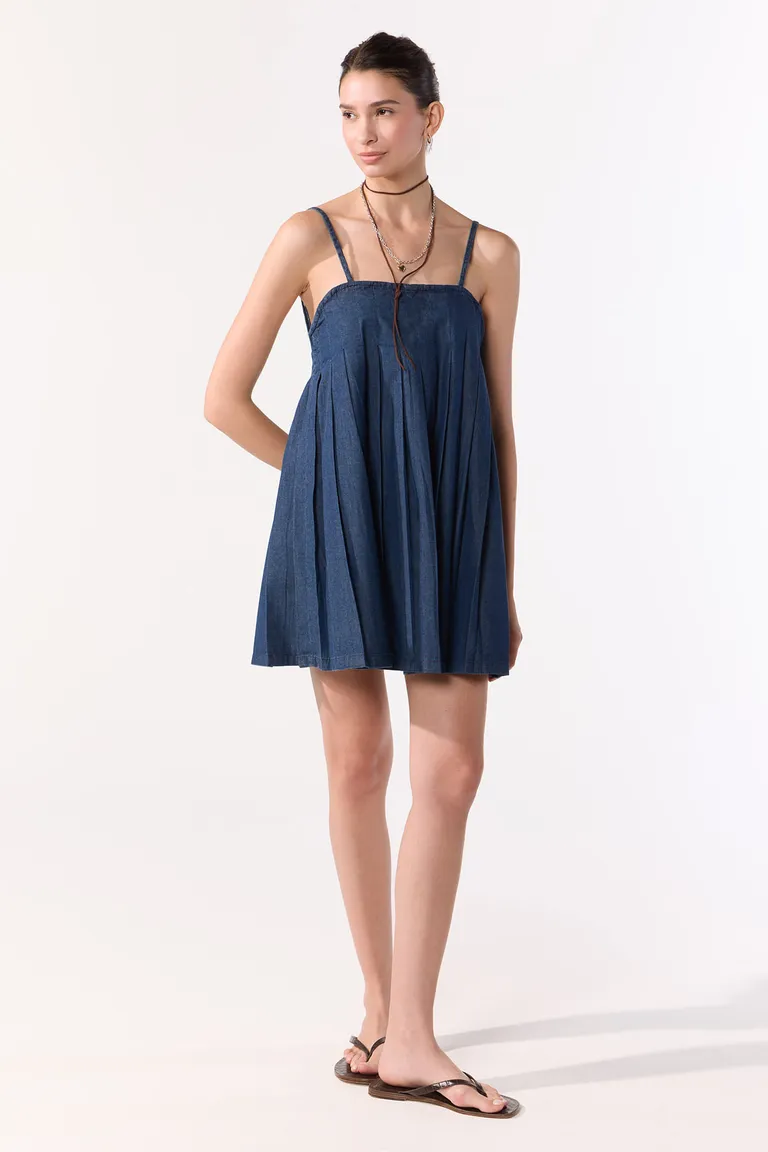 Vestido corto con breteles regulables, diseño con escote recto y detalle de frunces en la parte delantera y trasera. Presenta un corte holgado ideal para días de verano, con cierre trasero al tono que facilita su uso. Una prenda fresca y versátil que se adapta a diversas ocasiones.