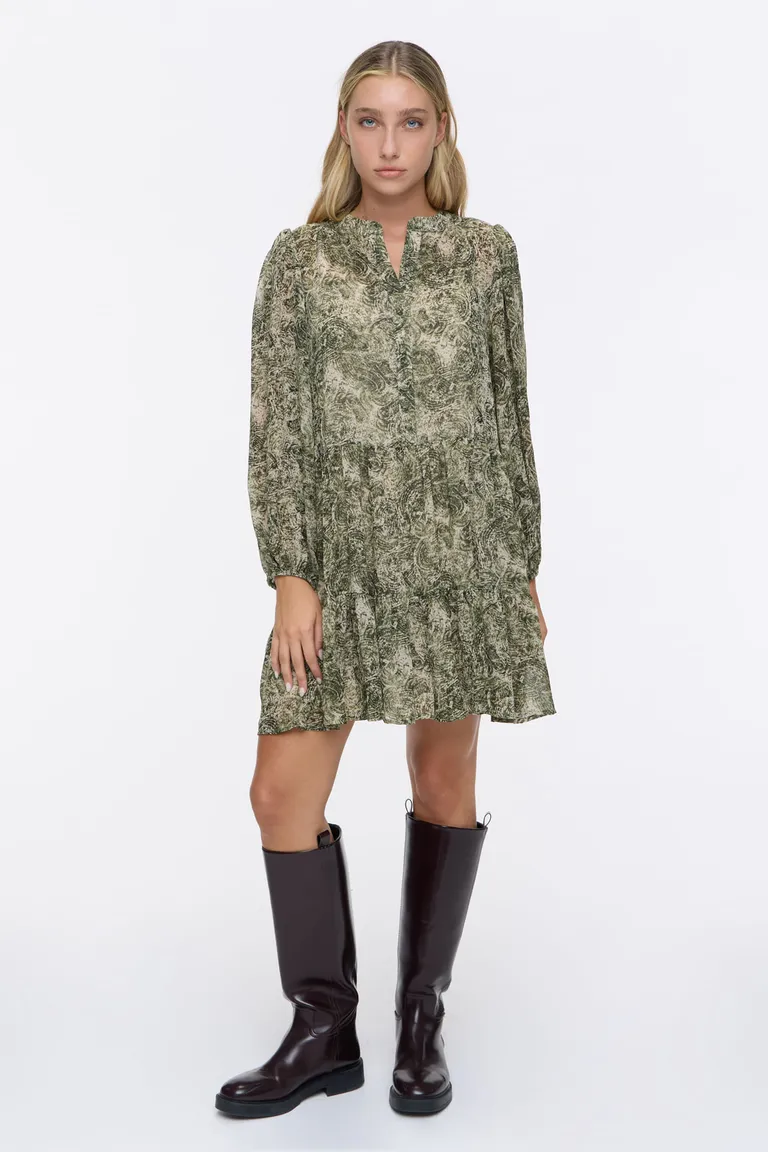 Vestido corto de diseño holgado con mangas largas y puños elastizados. Presenta una falda con recortes que aporta movimiento y volumen, junto con un cierre frontal de botones. Una prenda versátil ideal para combinar con diferentes estilos de calzado en toda ocasión.