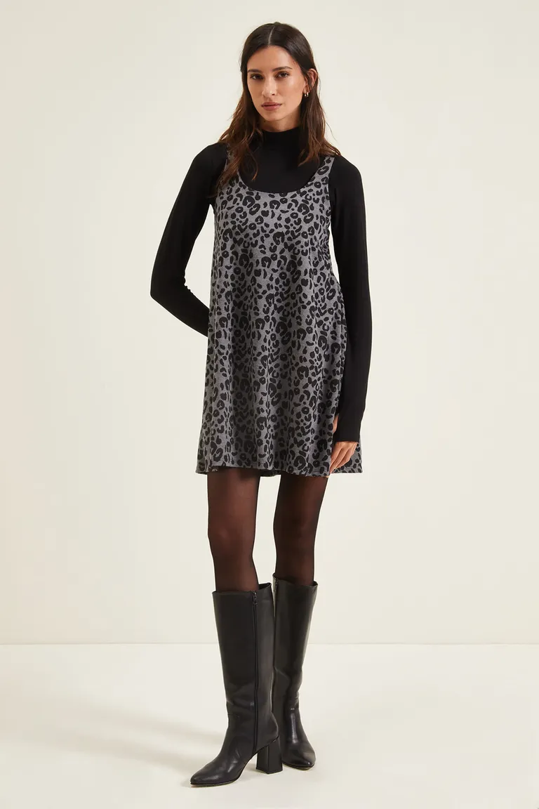 Vestido corto con escote redondo, diseñado con un corte jacquard y una tabla en la espalda para mayor comodidad. Presenta un estampado distintivo y un diseño sin mangas, ideal para combinar sobre otras prendas. Una opción versátil que aporta estilo a cualquier conjunto diario.