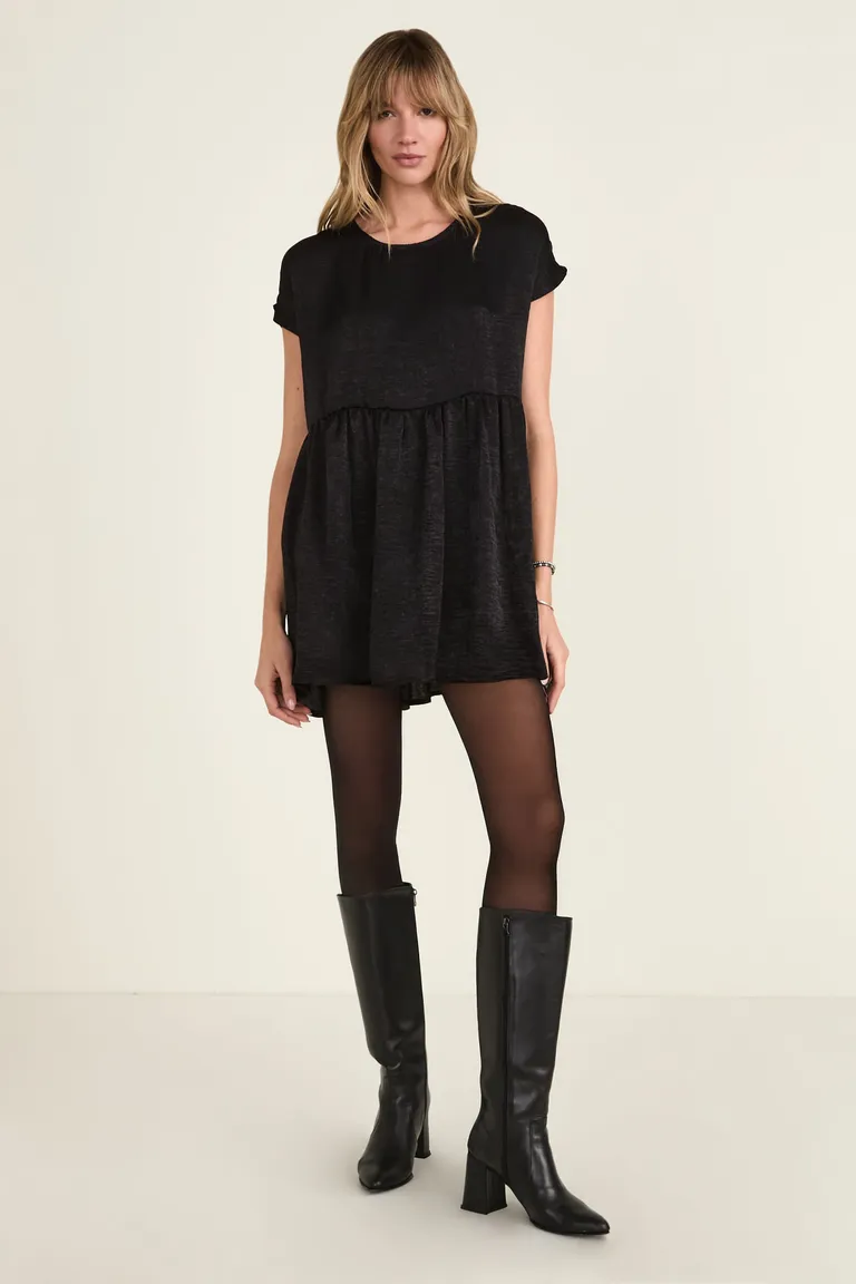 Vestido corto con corte a la cintura, diseño holgado y mangas cortas. Presenta un escote redondo clásico y un faldón fruncido que aporta movimiento. Ideal para lograr un look versátil y elegante en cualquier ocasión.