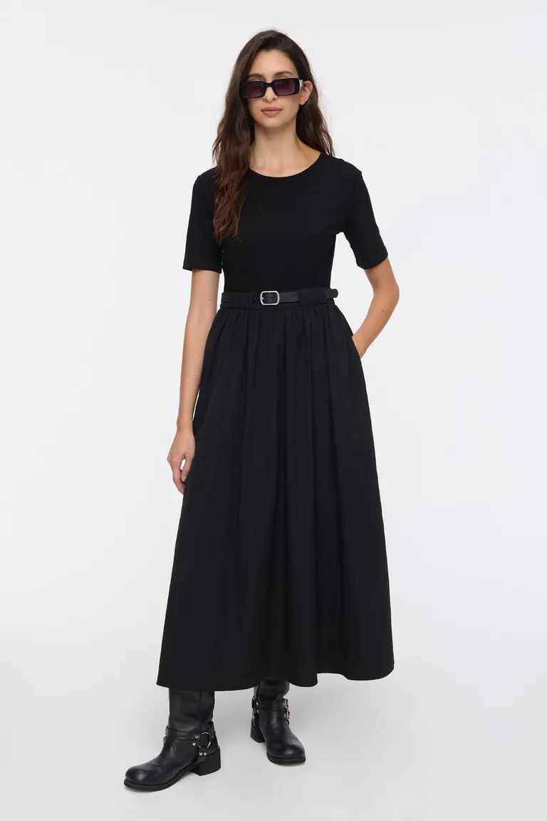 Vestido largo con diseño combinado que presenta un cuerpo superior ajustado y una falda con volumen. Incluye un cinturón para ajustar la silueta y cierre en la espalda. Una pieza versátil y elegante para usar en diversas ocasiones, que combina comodidad y estilo definido.