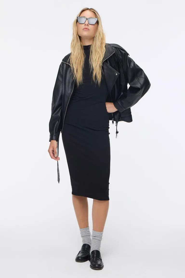 Vestido midi de corte ajustado al cuerpo con diseño de cuello alto tipo polera. Una prenda versátil y esencial para el guardarropa diario, ideal para combinar con diferentes estilos y accesorios. Presenta un largo por debajo de la rodilla y un calce cómodo que sigue la silueta, perfecto para lograr looks modernos y casuales en cualquier ocasión durante el día o la noche.