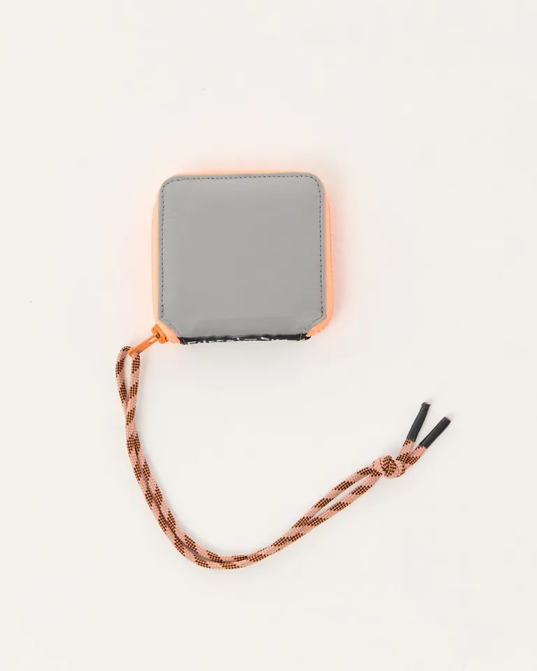 Billetera cuadrada con cierre y tira colgante ideal para organizar tarjetas y billetes. Un accesorio compacto y práctico para el uso diario que combina funcionalidad con un diseño moderno.