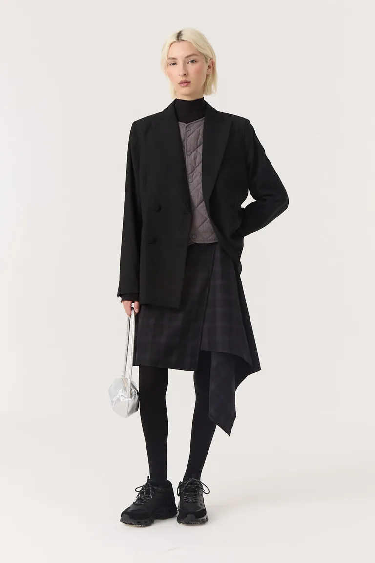Blazer sastrero de corte clásico con diseño cruzado, solapas marcadas y estructura definida en los hombros. Presenta cierre frontal mediante botones, bolsillos funcionales y un largo que llega a la altura de la cadera. Una prenda versátil de líneas limpias ideal para completar looks formales o urbanos con un toque sofisticado.
