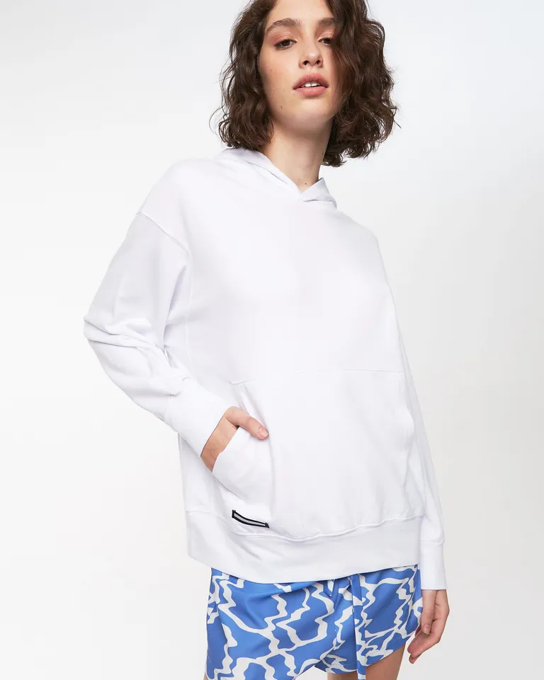 Buzo tipo canguro con capucha y bolsillo delantero. Presenta un calce amplio y cómodo, ideal para un look relajado. Incluye cordones ajustables y detalle de etiqueta identificatoria en el frente. Una prenda versátil para el uso cotidiano.