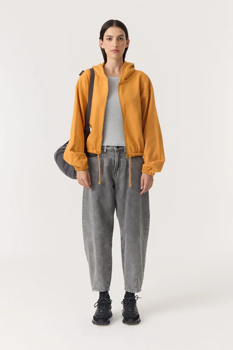 Buzo con cierre frontal y capucha ajustable mediante cordones. Diseño de corte holgado con elástico en los puños y en el ruedo inferior, ideal para un estilo urbano y casual. Prenda versátil de líneas simples que permite combinar con diferentes tipos de pantalones.