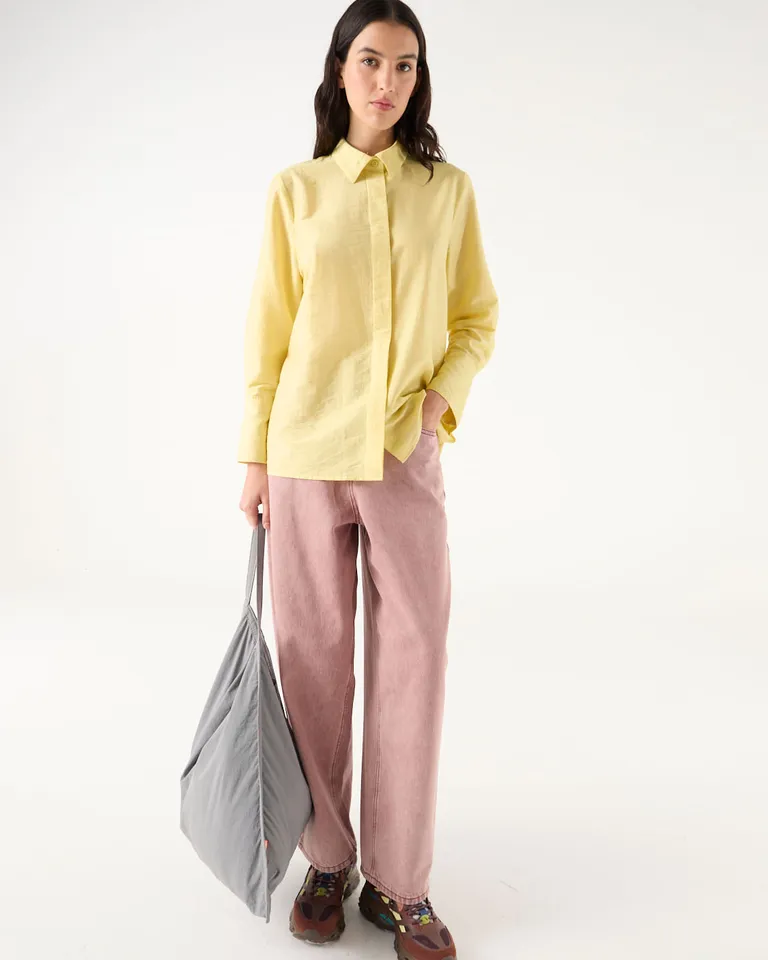 Camisa de corte recto confeccionada en tejido liviano tipo voile. Presenta una cartera con botones ocultos, diseño de mangas largas y un detalle funcional de presilla en la espalda. Una prenda versátil, cómoda y fresca, ideal para lograr un estilo casual y relajado en cualquier ocasión del día. Presenta botones personalizados en el frente y una caída holgada que favorece la silueta.