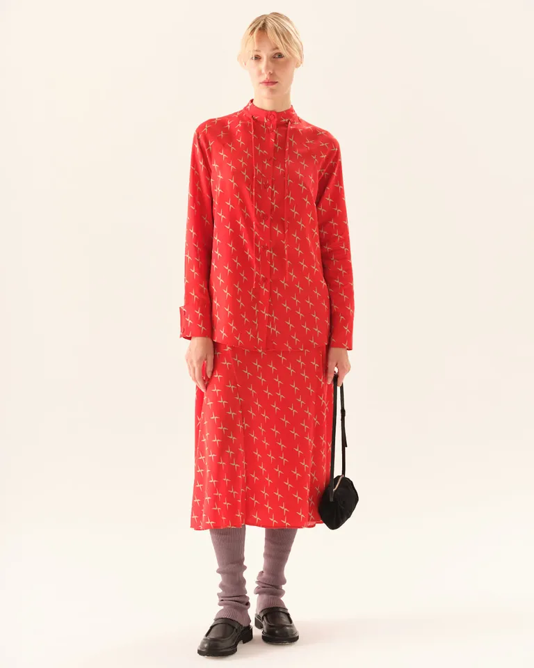 Camisa de corte recto con mangas largas y cuello mao, con un delicado diseño de estampado sutil. Presenta un cierre frontal con botones y una caída fluida que brinda comodidad y versatilidad para diversos estilos. Ideal para integrar en equipos urbanos o formales con un toque distintivo.