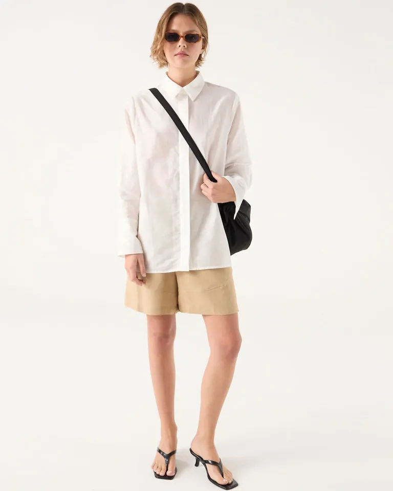 Camisa de corte recto con diseño clásico, cuello tradicional y cartera con botones ocultos. Presenta un estilo versátil ideal para combinar en diversos outfits cotidianos.