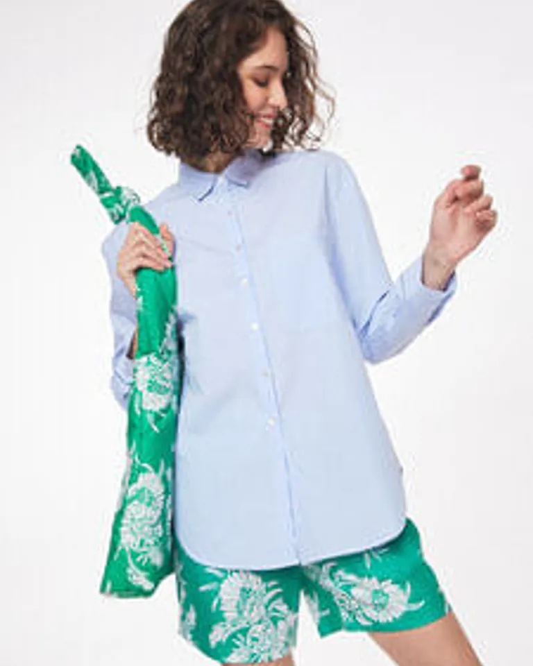Camisa de corte amplio y mangas largas con diseño de estilo clásico. Presenta un ruedo ligeramente redondeado, un bolsillo frontal y cierre tradicional mediante botones a la vista. Esta prenda ofrece un calce cómodo, ideal para un look versátil y relajado en cualquier ocasión.
