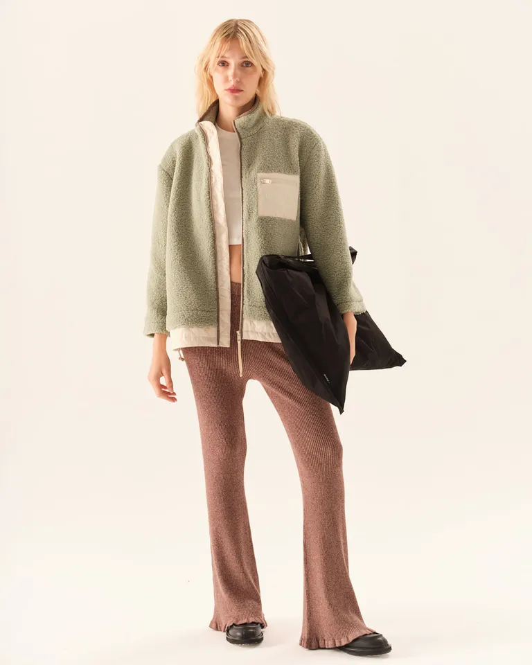 Campera con textura de pelo sintético, diseño de cuello alto y cierre frontal. Cuenta con un bolsillo aplicado en el frente y detalle de cordón ajustable en la cintura para lograr un calce cómodo y versátil. Ideal para complementar outfits diarios con un estilo funcional y urbano.