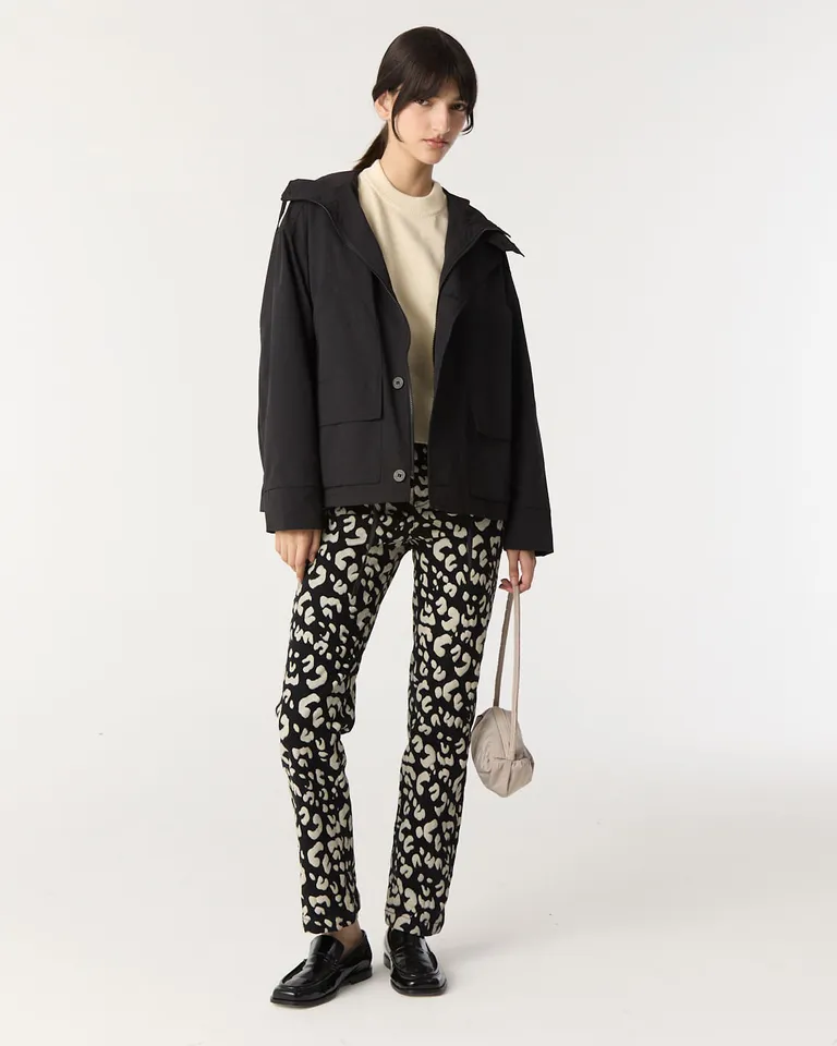 Campera con capucha y diseño de calce recto. Presenta bolsillos delanteros funcionales con doble acceso, ideal para completar outfits urbanos con una prenda de abrigo versátil y práctica.