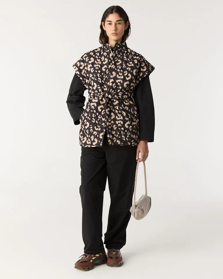 Chaleco acolchado con estampa, diseño de cuello alto y cierre mediante broches a presión. Incluye un lazo ajustable en la cintura y bolsillos laterales prácticos. Su calce holgado y largo hasta la segunda cadera lo convierten en una prenda versátil para sumar capas en días frescos, manteniendo una silueta moderna y funcional.