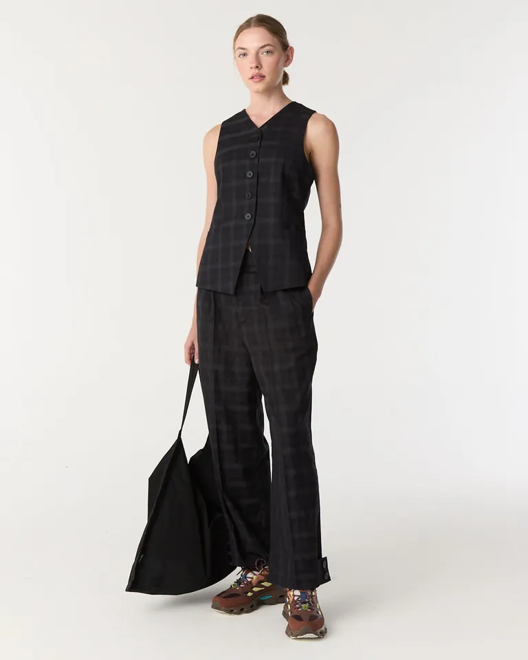 Chaleco sastrero con diseño de cuello en V y cierre frontal mediante botones. Presenta un corte midi ajustado con una martingala regulable en la espalda para un calce personalizado, ideal para completar equipos formales o urbanos con estilo.