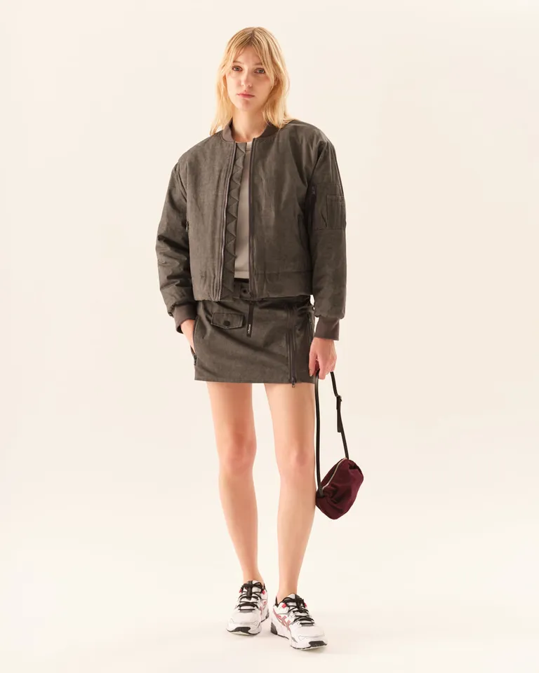Chaqueta tipo bomber de corte amplio y largo hasta la cadera. Cuenta con puños y cuello tejidos, cierre frontal a tono y bolsillos laterales con cierre. Incluye detalle de bolsillo funcional en la manga. Ideal para complementar cualquier conjunto urbano con un estilo moderno y versátil.