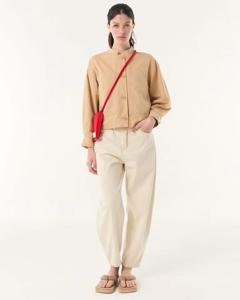 Chaqueta femenina de calce amplio con cuello mao y cierre frontal mediante botones. Presenta un diseño de hombros caídos y mangas largas con puños camiseros, ideal para un look casual y versátil. Su largo llega hasta la altura de la cadera, ofreciendo comodidad y un estilo moderno para el uso diario en diversas ocasiones.
