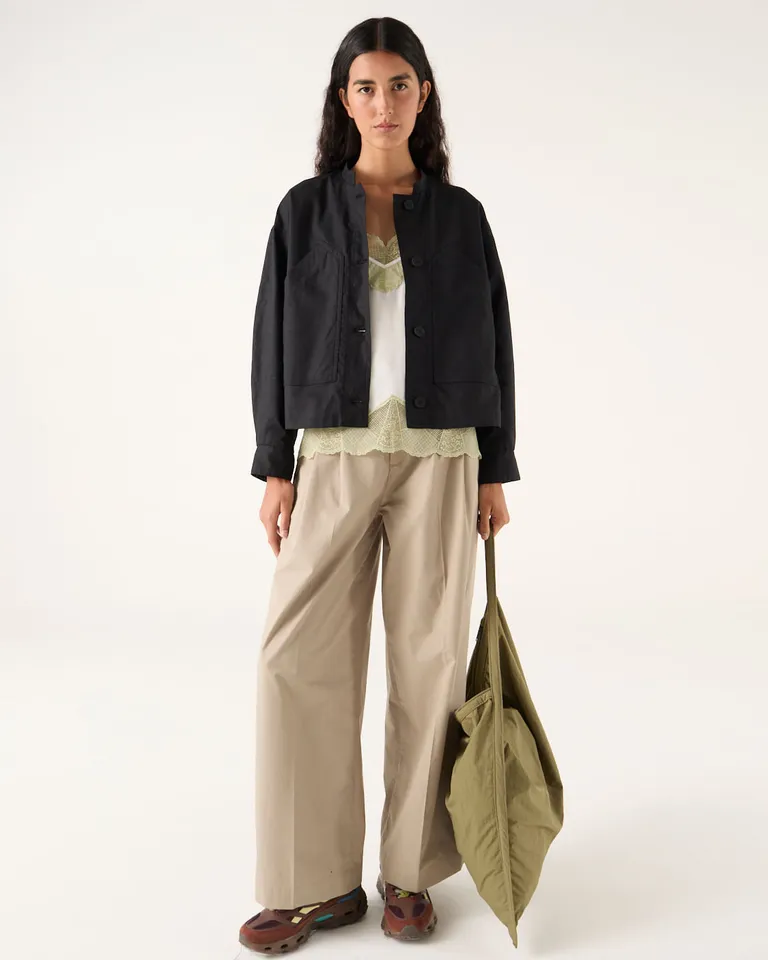 Chaqueta de corte amplio con cuello mao y hombros caídos. Presenta cierre frontal mediante botones grabados y mangas largas con puños camiseros. Su diseño cuenta con bolsillos frontales de gran tamaño y un largo a la altura de la cadera, ideal para completar looks urbanos y versátiles.