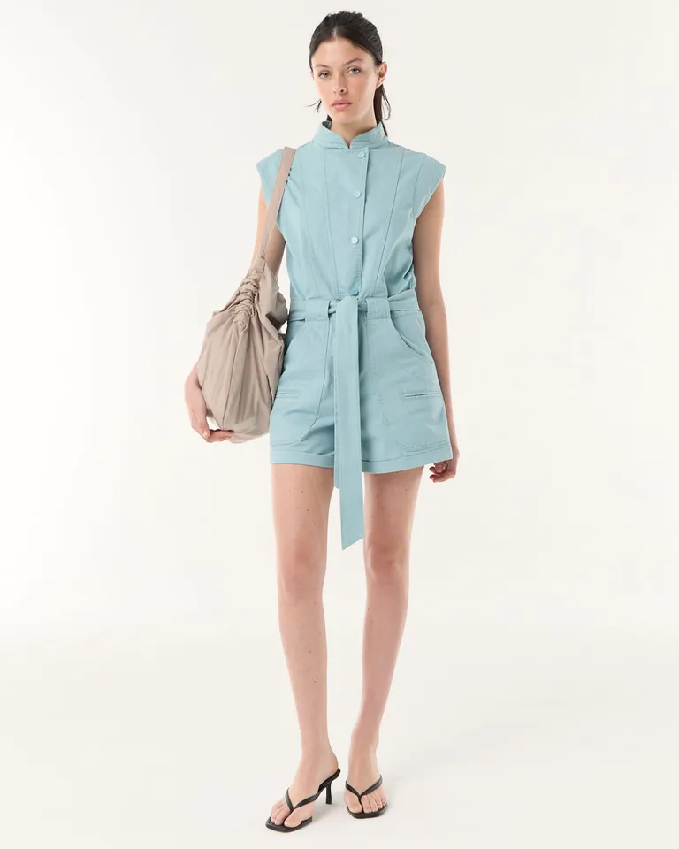 Enterito corto de diseño funcional con cuello tipo mao y sin mangas. Presenta un lazo ajustable en la cintura que permite entallar la silueta, junto a prácticos bolsillos frontales. Una prenda versátil ideal para un estilo urbano y casual durante los días de temperatura cálida, combinando comodidad y estructura en una sola pieza.