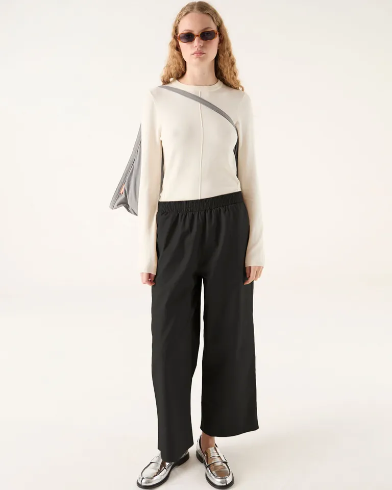 Pantalon de corte recto confeccionado con cintura elastizada y bolsillos laterales. Este modelo presenta un largo a la altura de los tobillos, brindando una silueta comoda y versatil para el uso cotidiano. Ideal para crear equipos urbanos y modernos durante toda la temporada.