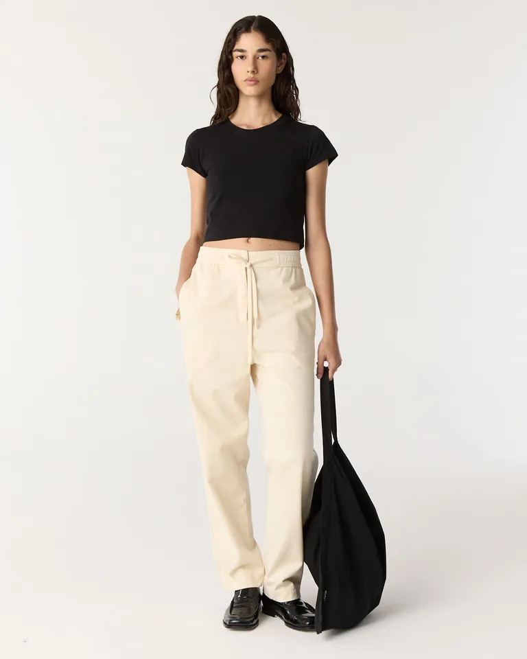 Pantalón de corte recto y relajado con cintura elástica y tiro alto. Presenta un diseño versátil con bolsillos laterales y en la parte posterior, ideal para un estilo urbano y casual. Su largo llega hasta el tobillo, ofreciendo comodidad y una silueta moderna para el uso diario.