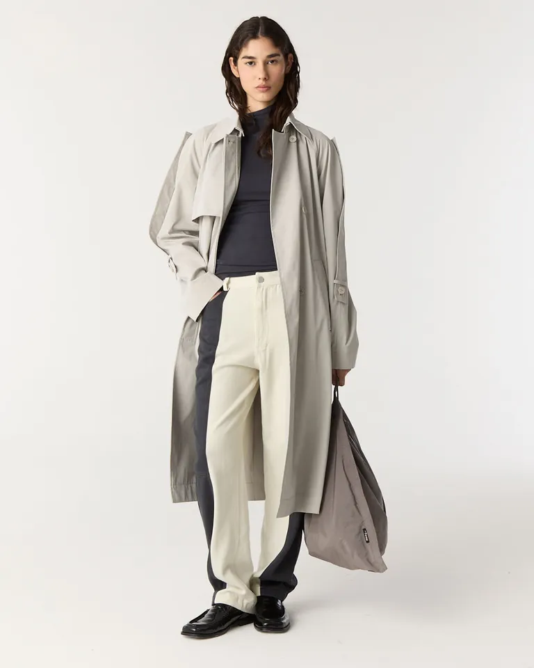 Pantalón de corte recto y holgado con diseño de bloques de color en las piernas. Presenta cierre oculto y botón, ofreciendo un estilo moderno y versátil. Su calce es cómodo y se extiende por debajo de los tobillos, ideal para un look casual y contemporáneo. Una prenda funcional que destaca por su diseño único y ajuste relajado.