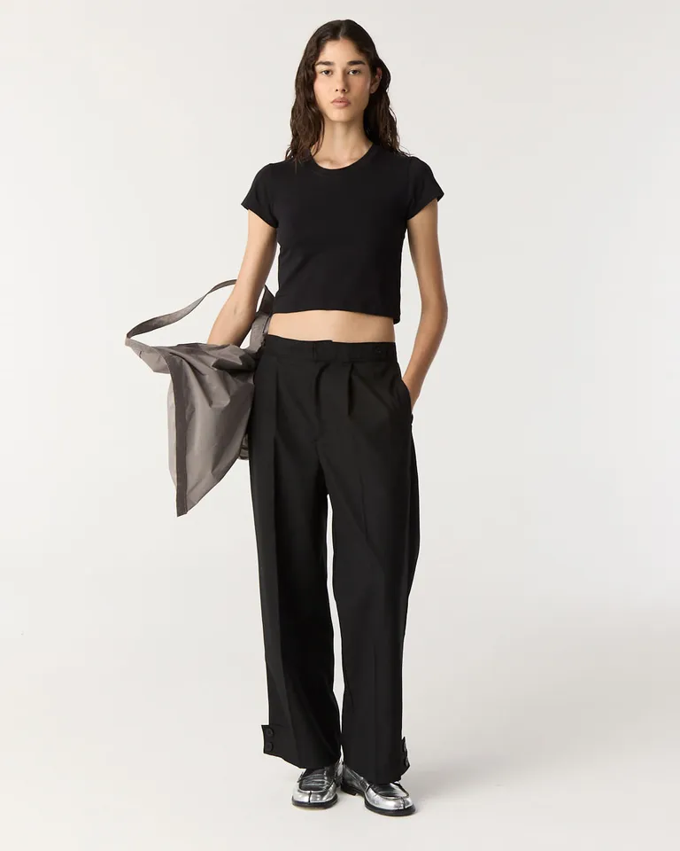 Pantalon sastre de corte recto con pinzas, disenado con precillas ajustables en cintura y botamanga. Presenta elastico en la parte posterior para mayor comodidad y un sistema de cierre con gancho oculto. Una prenda versatil, funcional y de calce estructurado, ideal para lograr un estilo sofisticado en diversas ocasiones.