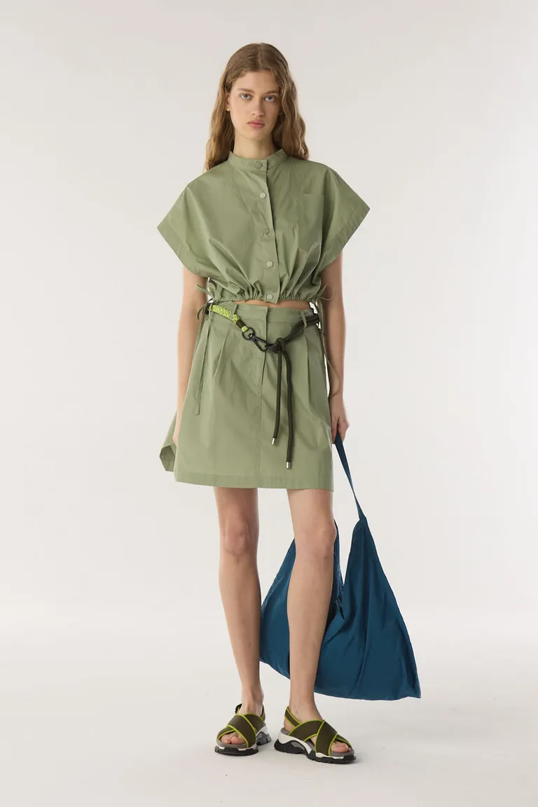 Pollera corta con diseño de cintura media y detalles funcionales en los laterales. Presenta una silueta práctica ideal para un estilo urbano y fresco. Incluye presillas en la cintura para ajuste con accesorios, manteniendo un corte clásico por encima de las rodillas.