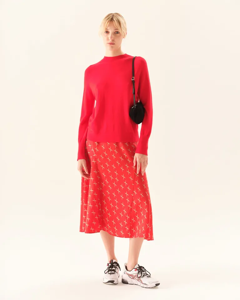 Pollera midi con estampa exclusiva. Presenta un calce a la cintura que se despliega con suavidad hacia el ruedo, aportando movimiento y un estilo versátil. Incluye detalles de recortes en los laterales que estilizan la silueta, ideal para combinar en diversos outfits diarios con una propuesta femenina y moderna.