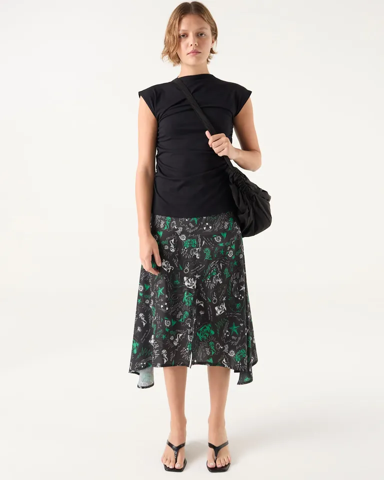 Pollera midi con estampa gráfica exclusiva. Presenta un diseño de silueta amplia con ruedo irregular y una sutil abertura frontal. Posee un ajuste a la cintura con cierre posterior, ideal para quienes buscan una prenda versátil y con estilo propio para completar sus looks urbanos cotidianos.