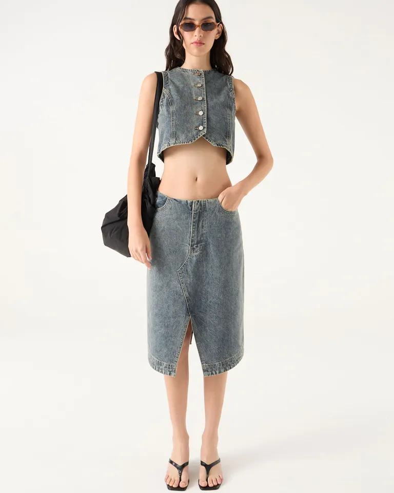 Pollera midi de denim con tiro medio, corte acampanado hacia el ruedo y una distintiva abertura frontal. Posee cierre en bragueta y un diseño sin cintura, ideal para looks informales y versátiles. Su largo a media pierna aporta una silueta moderna y estructurada.