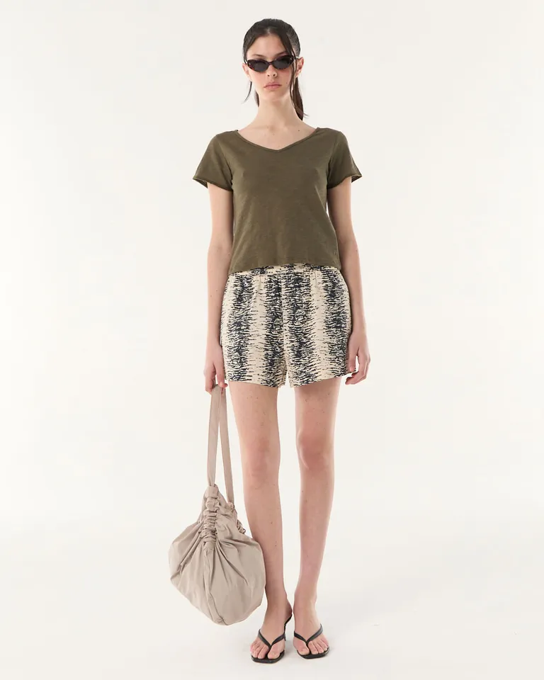 Remera básica de corte recto con escote en V y mangas cortas. Presenta un diseño versátil de calce regular, ideal para el uso diario. El largo alcanza la altura de la cadera, ofreciendo un ajuste cómodo y funcional. Una prenda esencial para completar diversos equipos urbanos.