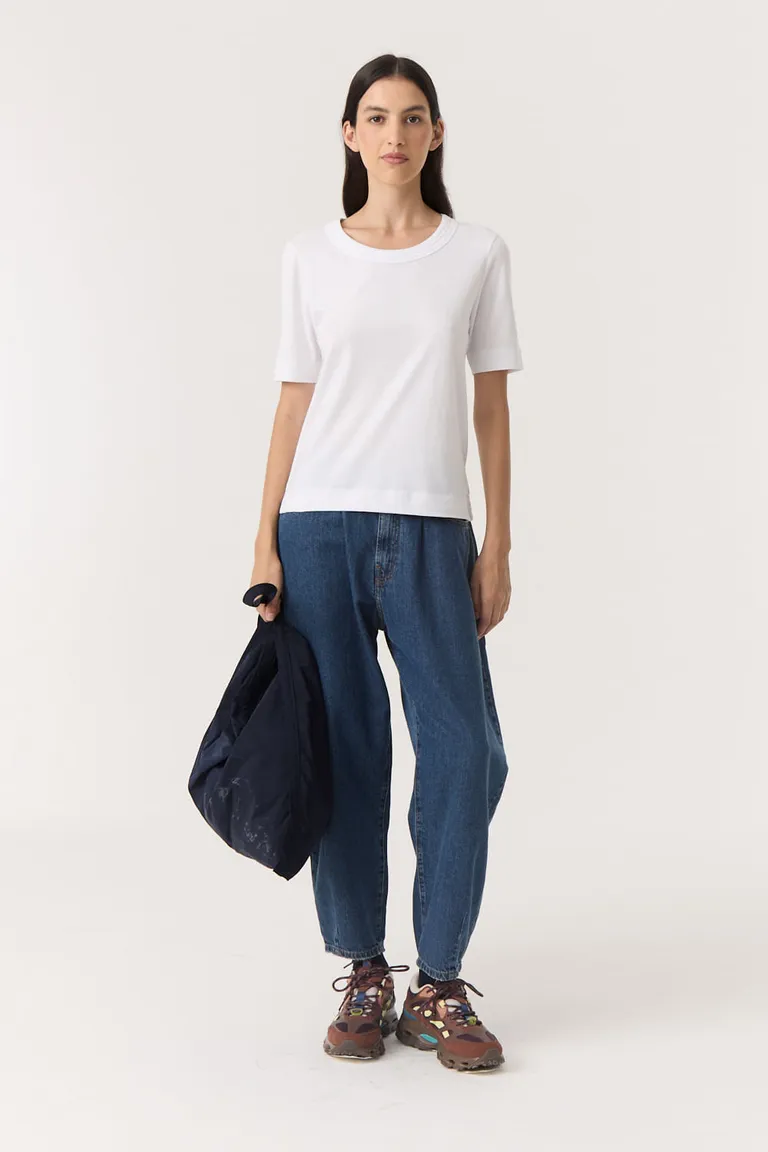 Remera de corte clásico con cuello redondo doble para un estilo versátil y diario. Presenta un ajuste regular, mangas cortas y una longitud ideal que llega a la cadera, perfecta para combinar en cualquier ocasión casual con diferentes prendas.