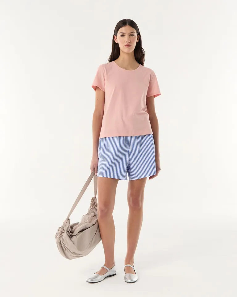 Remera básica de cuello redondo y manga corta. Presenta un diseño de calce regular con tajos laterales y ruedo levemente escalonado. Una prenda esencial para incorporar en tus outfits diarios, ofreciendo comodidad y versatilidad gracias a su corte recto a la cadera.