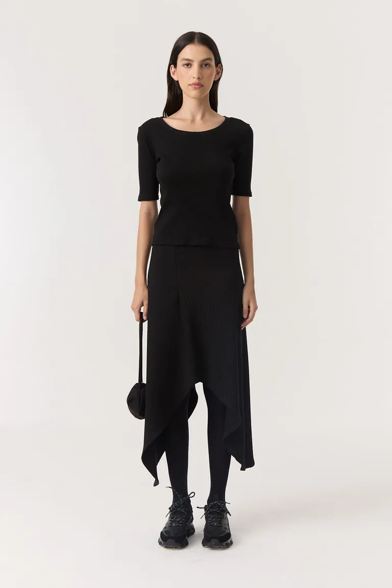 Remera de calce al cuerpo con mangas cortas hasta el codo y escote redondo. Presenta un diseño de líneas simples con textura acanalada, ideal para combinar en cualquier ocasión por su versatilidad y ajuste cómodo. Largo hasta la altura de la cadera.