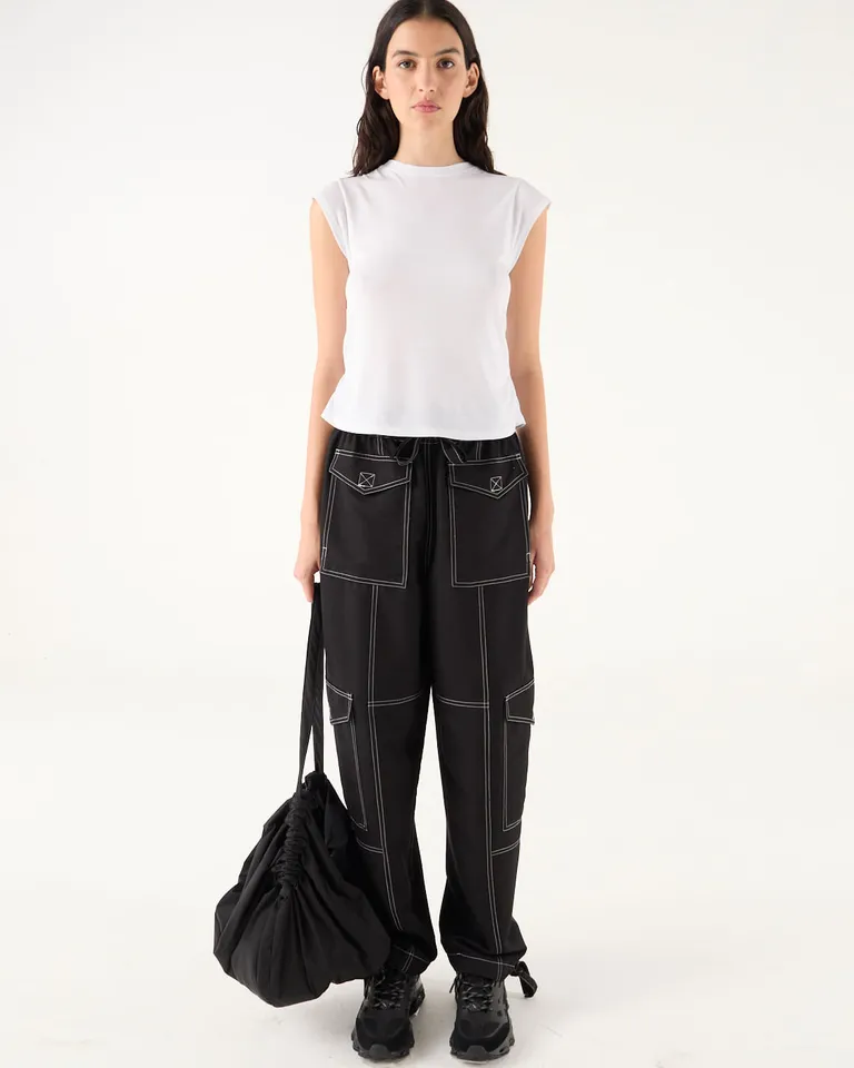 Remera de corte clásico con escote redondo y mangas cortas. Presenta un diseño versátil con detalles de frunces en los laterales que aportan movimiento, ideal para combinar en looks urbanos o informales. Su calce regular en hombros y sisa garantiza comodidad durante todo el día, finalizando a la altura de la cadera para un ajuste favorecedor.
