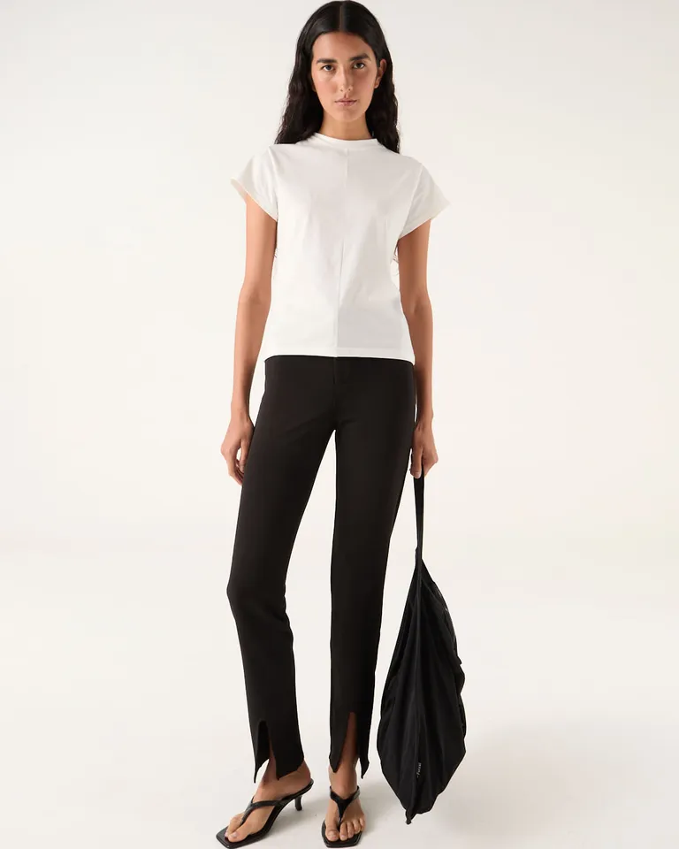 Remera de corte entallado con manga corta y detalle de costura central vertical. Presenta un calce regular en los hombros, ideal para combinar en looks diarios. Su diseño versátil y líneas limpias la convierten en una prenda básica esencial para cualquier guardarropas, aportando comodidad y estilo en un diseño minimalista de uso cotidiano.