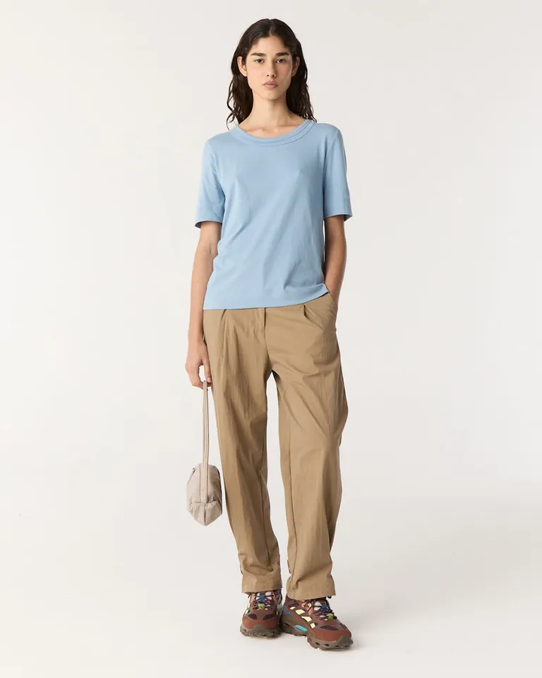 Remera de corte clásico con diseño de cuello redondo doble. Presenta un calce regular cómodo, mangas cortas y una caída natural que llega hasta la cadera. Una prenda versátil ideal para integrar en looks cotidianos, ofreciendo un estilo funcional y atemporal para completar diversos outfits con facilidad.