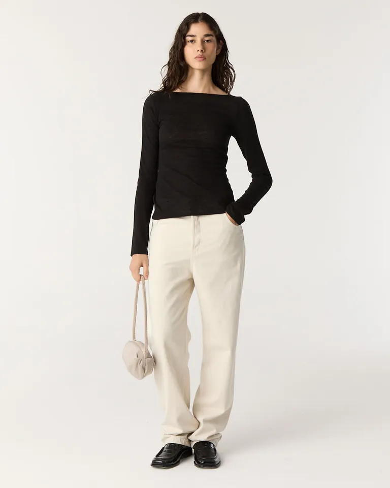 Remera de punto con escote bote. Esta prenda presenta un calce al cuerpo con mangas largas y terminaciones de vivo. Su diseño clásico la convierte en una opción versátil para completar diversos outfits diarios.