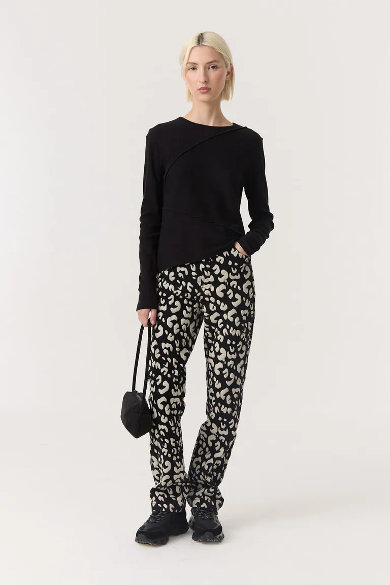 Remera de manga larga con cuello redondo, destacada por sus recortes que generan un sutil cambio de dirección en la trama del tejido y un ruedo irregular. Posee un calce cómodo en hombros y sisa con un largo que llega hasta la primera cadera. Ideal para completar looks casuales y urbanos con un toque de diseño diferenciado.