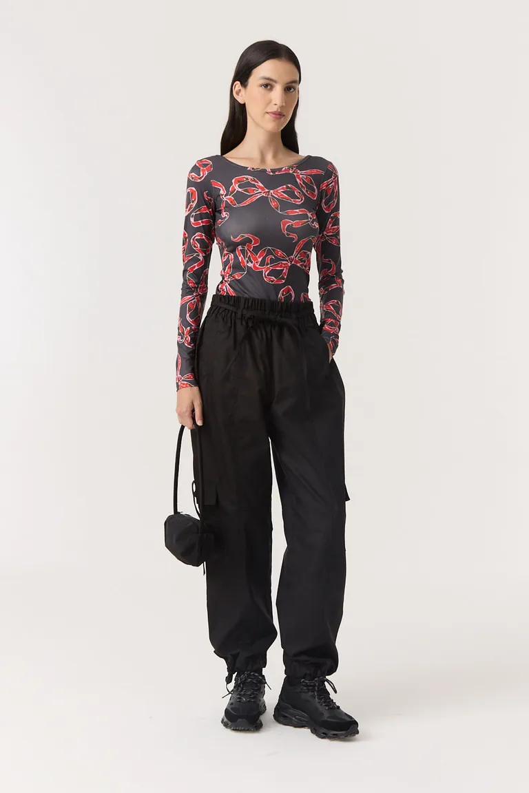 Remera manga larga con estampa de lazos, cuello cerrado y espalda baja ajustada al cuerpo de Furzai