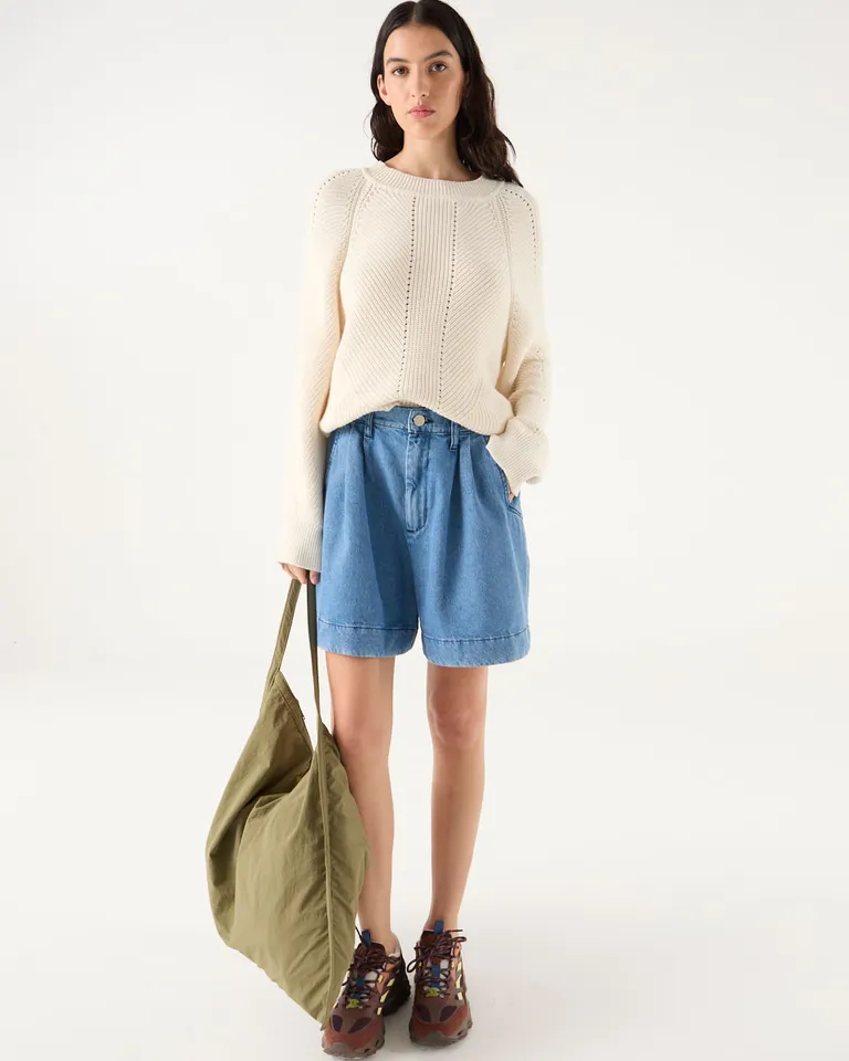Short de jean de tiro alto con pinzas en la cintura y piernas amplias. Presenta un diseño cómodo con bolsillos laterales, presillas para cinturón y elástico en la parte trasera para un mejor ajuste. Un modelo versátil de largo sobre la rodilla, ideal para completar tus outfits diarios con estilo y confort. Acceso mediante cierre y botón metálico.
