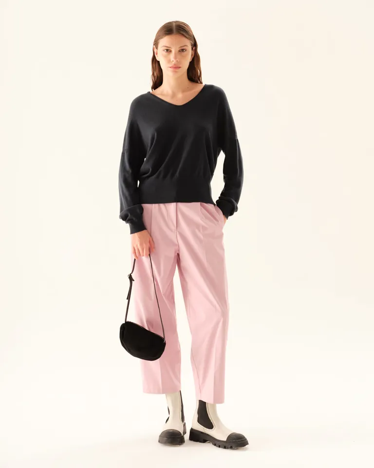 Sweater liviano con diseño de cuello en v. Presenta un calce amplio y cómodo con terminaciones de puños ajustados tanto en la cintura como en las mangas, ideal para complementar diversos outfits diarios.