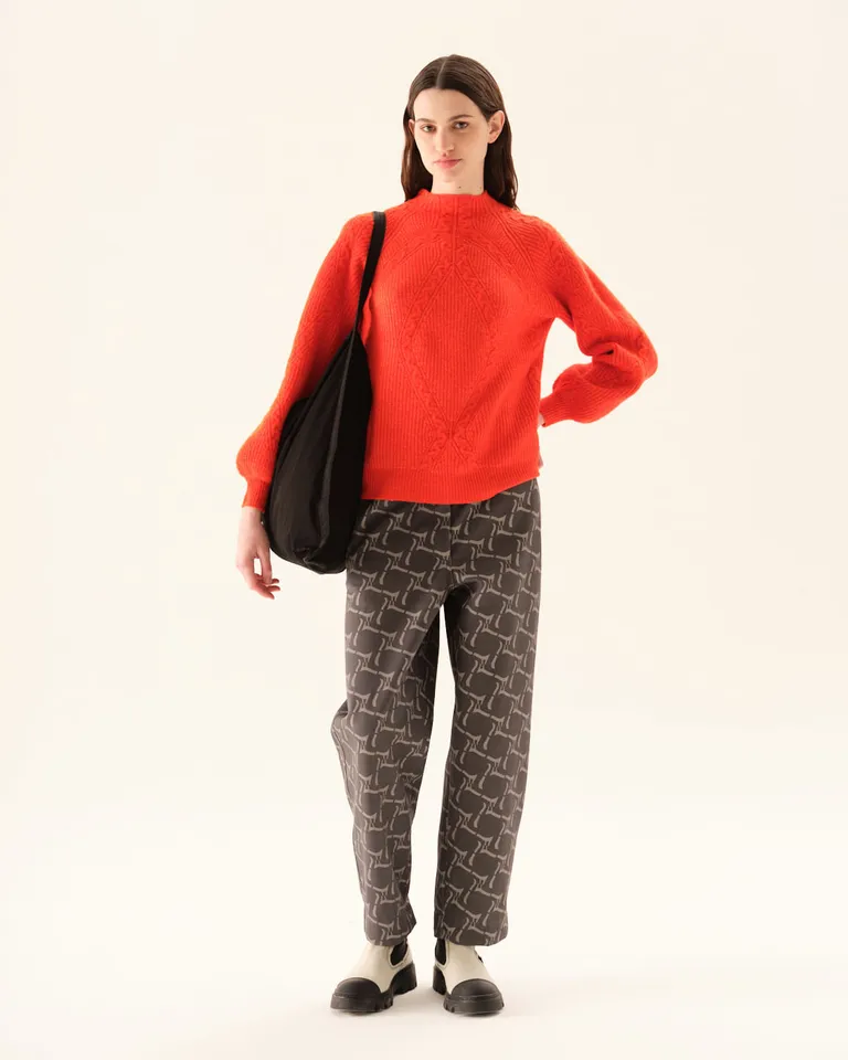 Sweater de tejido con detalle de trenzas y cuello alto. Presenta mangas ranglan con silueta ligeramente suelta y largo a la cadera, ideal para un look casual y cómodo de media estación. Una prenda versátil con textura suave y diseño clásico para el uso cotidiano.