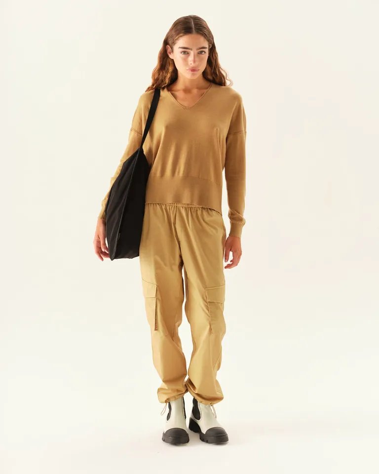 Sweater femenino con escote en v, diseñado con un calce cómodo y holgado. Presenta puños ajustados tanto en la terminación de las mangas como en la parte inferior, brindando una silueta versátil para combinar en cualquier ocasión. Una prenda esencial para renovar el guardarropa con estilo y confort.