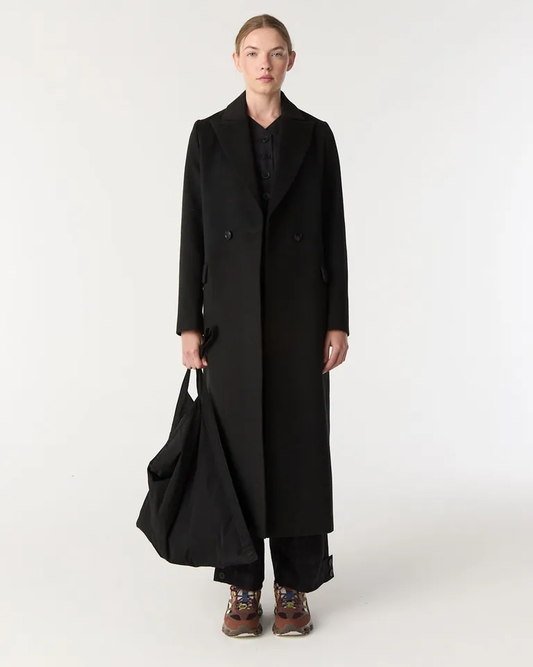Abrigo largo de corte sastrero con cuello solapa y diseño cruzado. Presenta un calce regular con caída hasta los tobillos, bolsillos laterales con tapa y cierre frontal mediante botones. Una prenda versátil ideal para complementar outfits urbanos durante los días de bajas temperaturas.